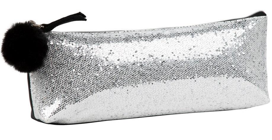 Jednokomorowy piórnik z brokatowego, srebrnego materiału z futerkowym pomponem przy zamku.