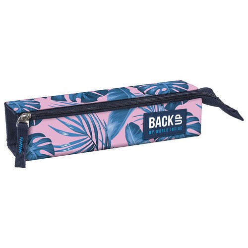 Piórnik BackUP model C 20 wzór inspirowany naturą, gdzie na różowym tle widnieją supermodne, uwielbiane przez influencerów liście monstery w intensywnym niebieskim kolorze. Opatentowany model piórnika, bardzo poręczny o przekroju kwadratu. Po otwarciu odsłania całą zawartość bez konieczności poszukiwania wewnątrz czegokolwiek.