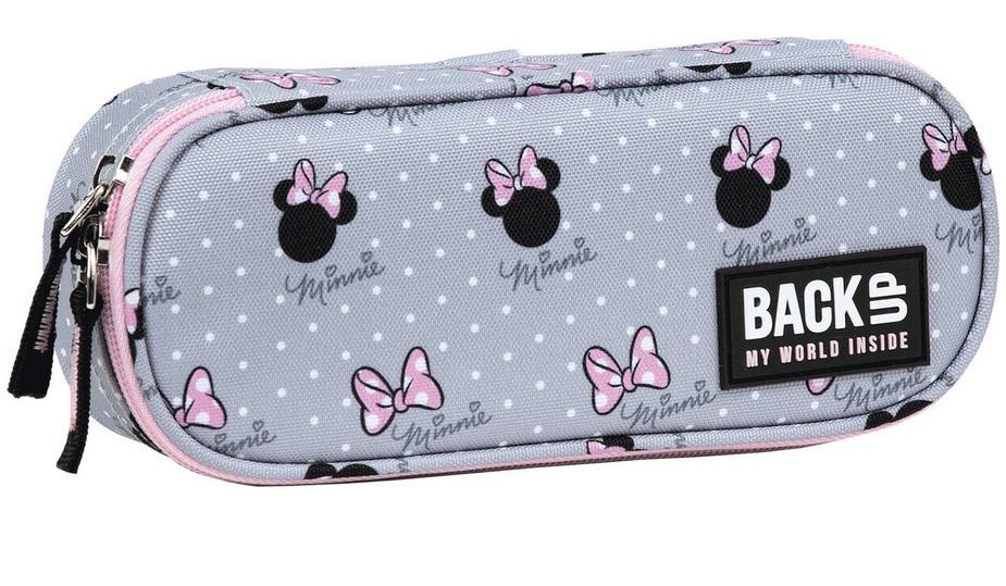 Piórnik w ponadczasowy wzór myszki Minnie z nieodłączną kokardką na szarym tle.