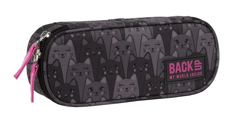 Piórnik w koty w odcieniach szarości. Delikatny akcent w postaci różowych uchwytów przy suwakach i logo na naszywce.