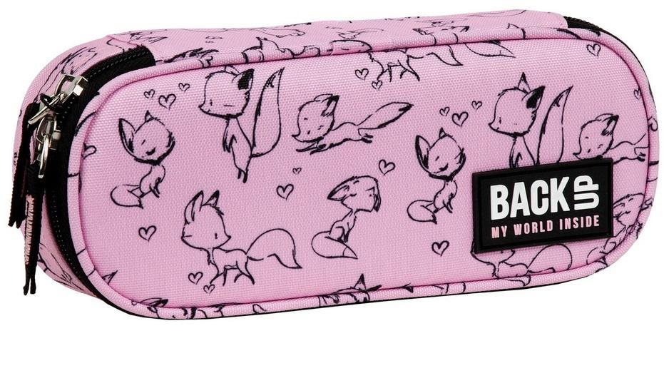 Jednokomorowy piórnik love - pudrowo - różowy w naszkicowane zakochane liski. Kontrastowe czarne zamki.