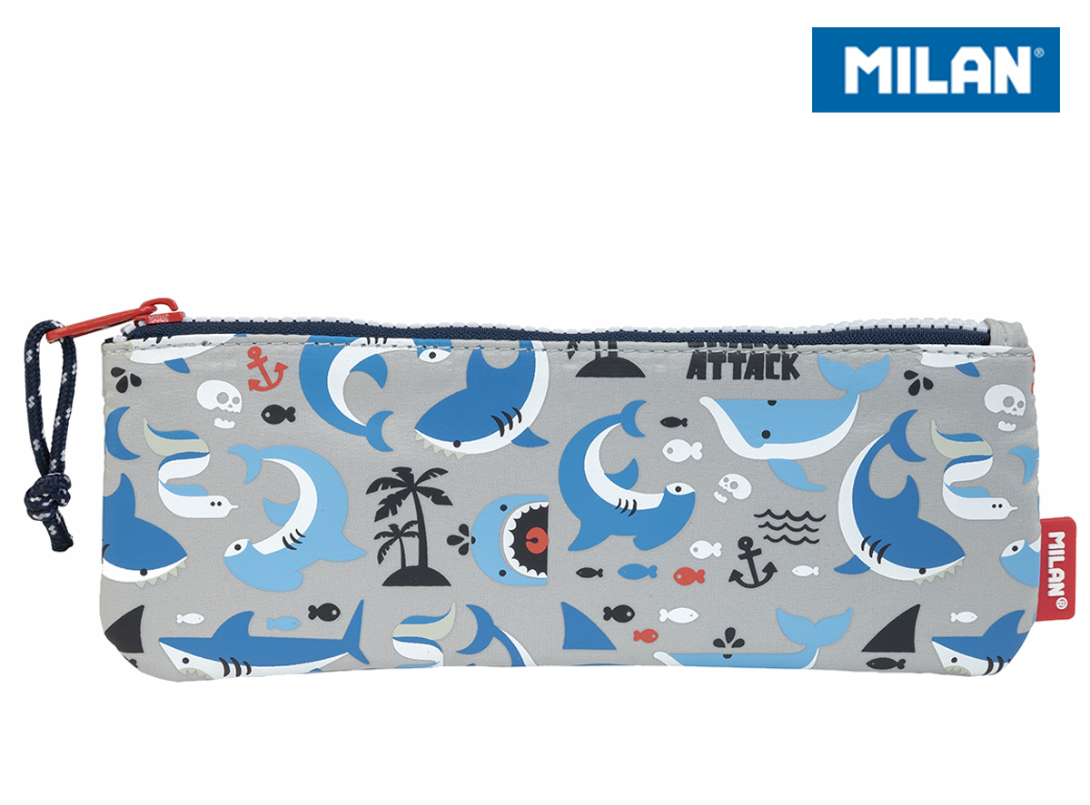 Piórnik MILAN mini płaski z kolekcji SHARK ATTACK zapinany na suwak w kolorze szarym. Materiał: podszewka zewnętrzna i wewnętrzna z poliestru. Rozmiar: 23 x 9 x 1.5 cm.