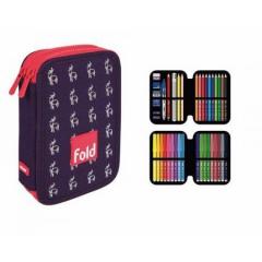 Piórnik MILAN 2-poziomowy z wyposażeniem Kolekcja: FOLD. Idealny do domu lub szkoły. Wyposażenie: 12 kredek trójkątnych, 18 flamastrów ze stożkową końcówką, długopis P1, ołówek trójkątny HB, temperówka AFILA, 2 gumki syntetyczne, linijka trójkątna.