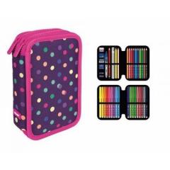 Piórnik MILAN 2-poziomowy z wyposażeniem Kolekcja: N-DOTS . Idealny do domu lub szkoły. Wyposażenie: 12 kredek trójkątnych, 12 flamastrów ze stożkową końcówką, długopis P1, ołówek trójkątny HB, temperówka AFILA, 2 gumki syntetyczne, linijka trójkątna.