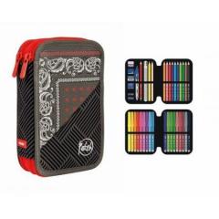 Piórnik MILAN 2-poziomowy z wyposażeniem Kolekcja:PATCH . Idealny do domu lub szkoły. Wyposażenie: 12 kredek trójkątnych, 18 flamastrów ze stożkową końcówką, długopis P1, ołówek trójkątny HB, temperówka AFILA, 2 gumki syntetyczne, linijka trójkątna.