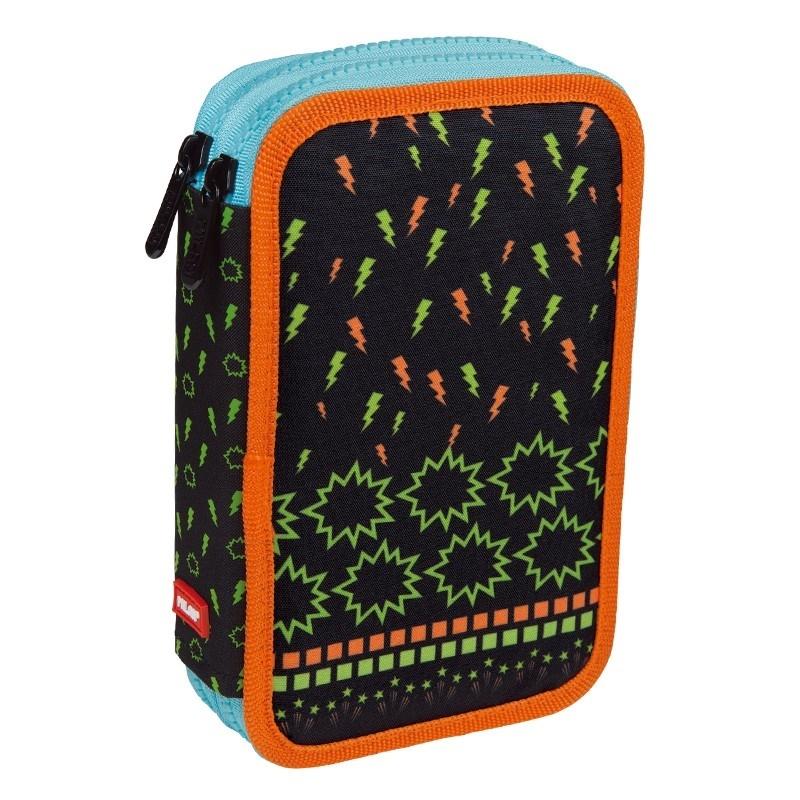 Piórnik MILAN 2-poziomowy z wyposażeniem z kolekcji SUPER HEROES w kolorze czarnym z kolorowym nadrukiem.