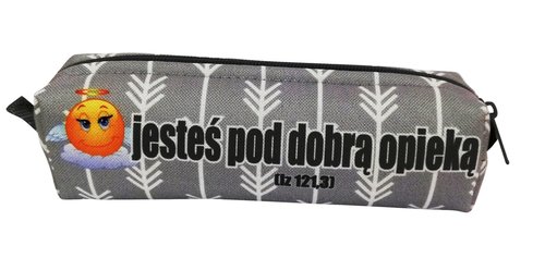 Piórnik jednokomorowy wykonany z grubego materiału typu pianka.Piórnik można prać w pralce. Wymiary 18 cm x 5 cm x 5 cm. Bardzo ładnie wykonany. Produkt polski. Nadruk - cytat z Biblii.