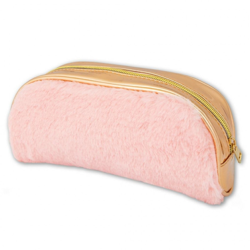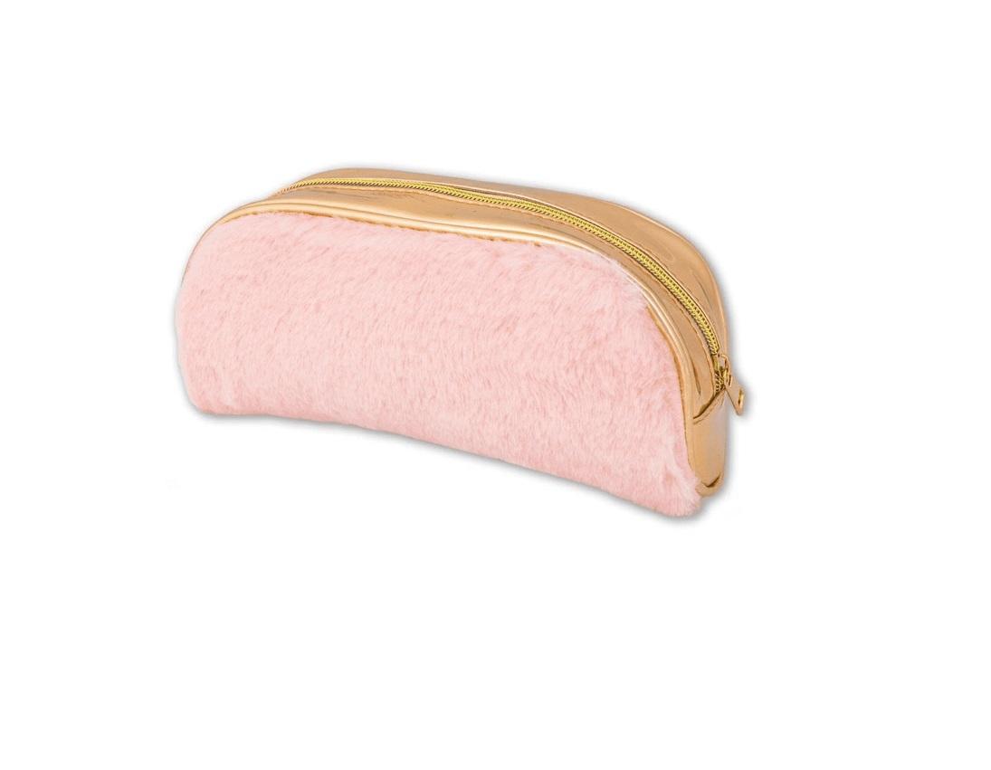 Różowy piórnik o króciótkim futerku, wykończony złotym materiałem. Zamykany na suwak błyskawiczny, od wewnątrz wykwykończony podszewką.