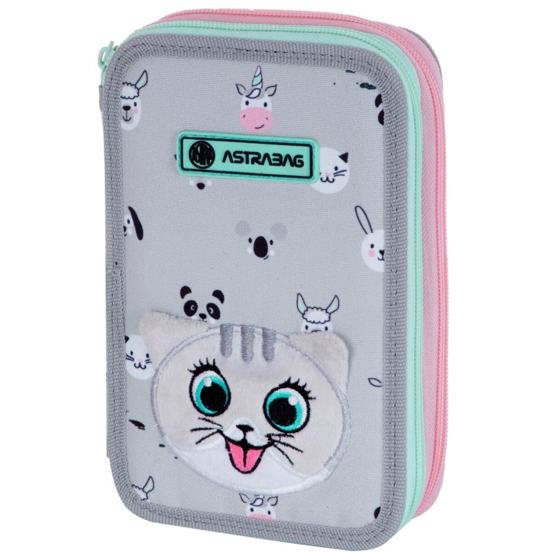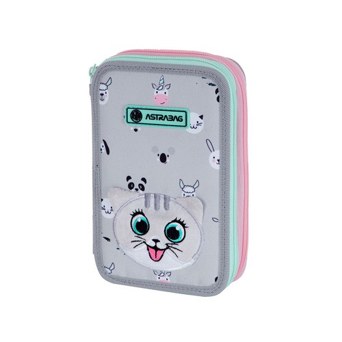 Dwukomorowy piórnik Astrabag został stworzony z myślą o wszystkich miłośniczkach kotków. Na jego froncie znajduje się naszyty pluszowy pyszczek mruczka, który jest przemiły w dotyku. Dodatkowo szara kolorystyka przeplatana pastelowymi odcieniami różu i mięty skradnie serce każdej dziewczynki. Piórnik Astrabag nie posiada wyposażenia. Jednak dzięki pojemnym dwóm komorom pomieści niezbędne przybory w tym kredki, flamastry, ołówki, długopisy i linijki.
