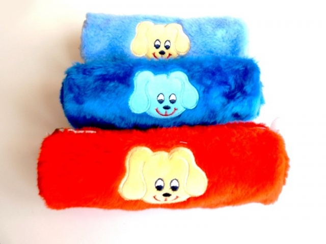 Piórnik tuba z materiału zabawkarskiego (miś) z wyhaftowaną głową pieska. Produkt Polski.