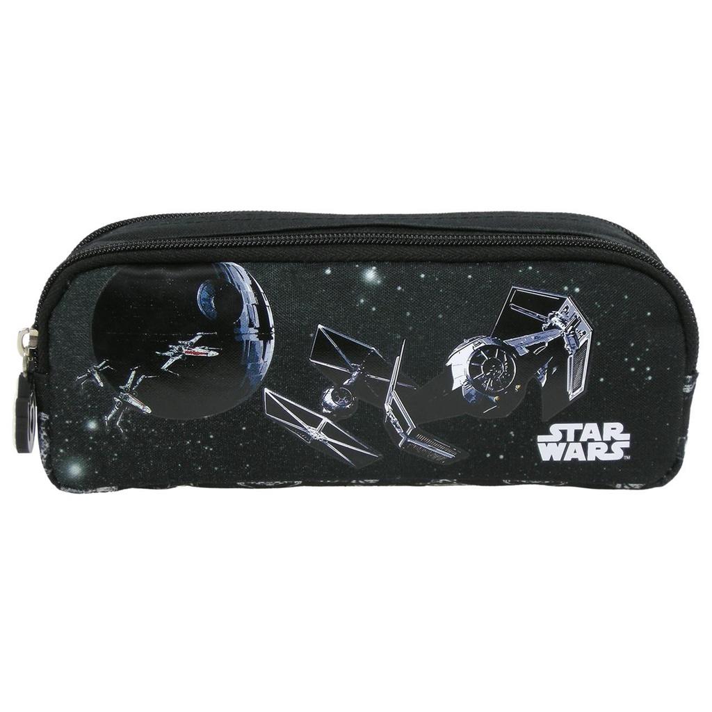 Piórnik saszetka, dwukomorowy, ozdobiony motywami Star Wars. Zamki błyskawiczne z ozdobnymi uchwytami.