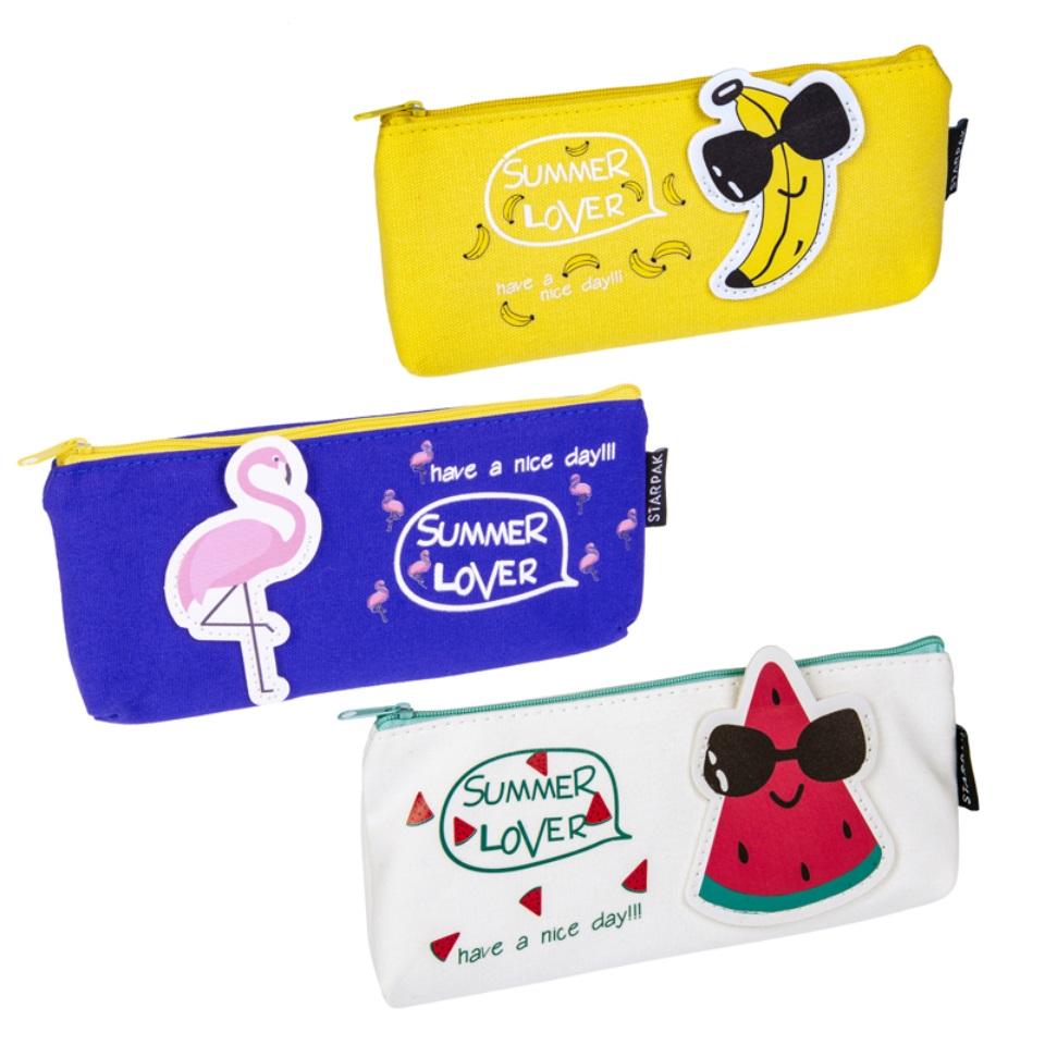 Piórnik w kształcie saszetki z kolekcji Starpak z zamkiem błyskawicznym. Piórnik pomieści niezbędne artykuły piśmiennicze i nie zajmie dużo miejsca w plecaku. Produkt dostępny w trzech młodzieżowych wersjach graficznych, przedstawiających letnie wzory z bananem, arbuzem i flamingiem. Zapoznaj się również z innymi produktami Starpak z serii dedykowanej młodzieży! Produkt jest wyrobem tekstylnym. Przeznaczony dla dzieci w wieku: 3+.