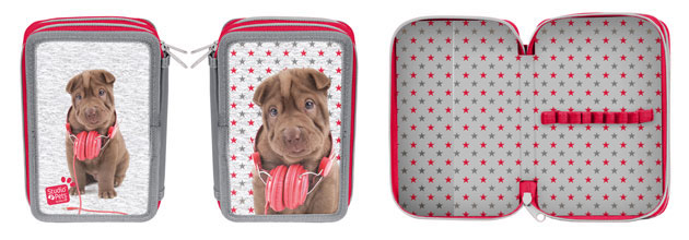 Piórnik 3-komorowy bez wyposażenia. Zadrukowane kolorowe wnętrze.