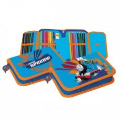 Zapinany piórnik z 2 klapkami. Elastyczne uchwyty na przybory szkolne. Wnętrze laminowane grubą, zbrojoną folią – odporniejsze na uszkodzenia przy użytkowaniu. Wyposażenie: 12 pisaków, ołówek, gumka, temperówka, długopis, 10 kredek ołówkowych, linijka, plan lekcji, tabliczka mnożenia.