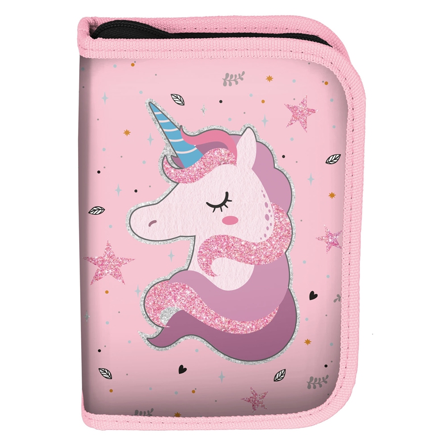 Piórnik jednokomorowy z dwoma klapkami z wyposażeniem (długopis, ołówek, 7 pisaków, 9 kredek, gumka, linijka, temperówka, ekierka). Zadrukowane kolorowe wnętrze.