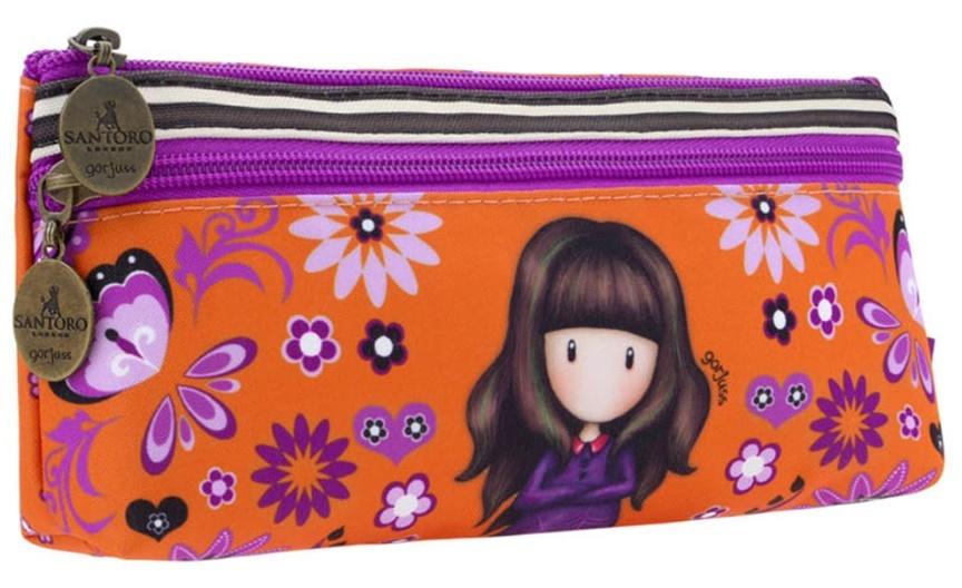 Piękny piórnik ozdobiony grafiką w odcieniach królewskiej purpury i nasyconego pomarańczu.
