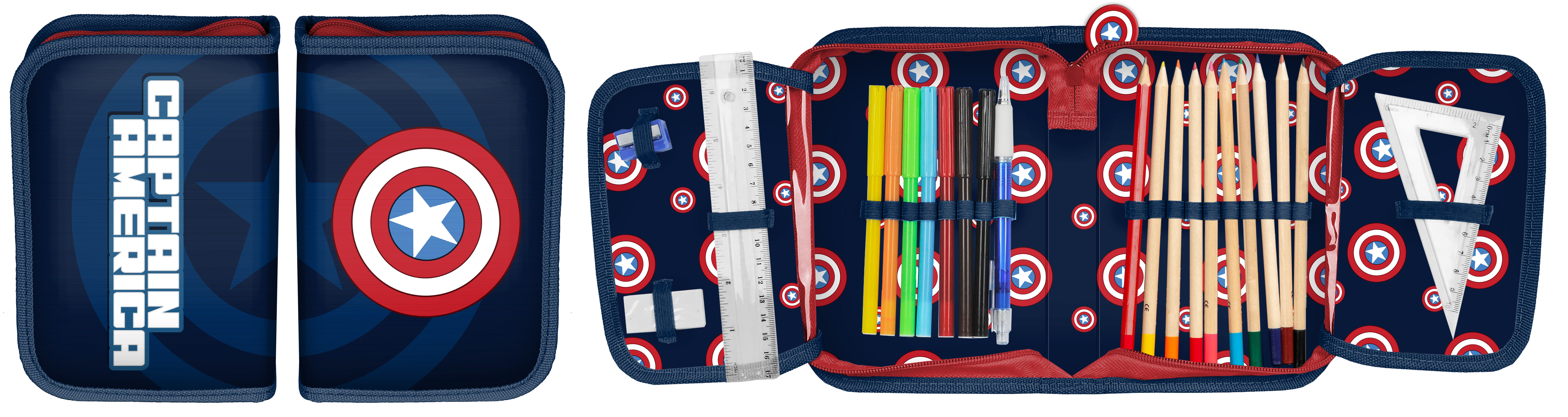 Piórnik jednokomorowy z dwoma klapkami z wyposażeniem (długopis, ołówek, 7 pisaków, 9 kredek, gumka, linijka, temperówka, ekierka). Zadrukowane kolorowe wnętrze.