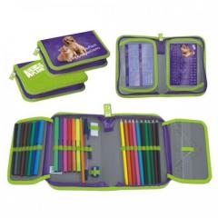 Zapinany piórnik z 2 klapkami. Elastyczne uchwyty na przybory szkolne. Wnętrze laminowane grubą, zbrojoną folią – odporniejsze na uszkodzenia przy użytkowaniu. Wyposażenie: pisaki, ołówek, gumka, temperówka, długopis, kredki ołówkowe, linijka, plan lekcji, tabliczka mnożenia.