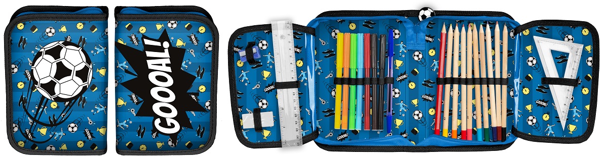 Piórnik jednokomorowy z dwoma klapkami z wyposażeniem (długopis, ołówek, 7 pisaków, 9 kredek, gumka, linijka, temperówka, ekierka). Zadrukowane kolorowe wnętrze.
