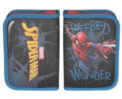 Piórnik jednokomorowy z dwoma klapkami z wyposażeniem (długopis, ołówek, 7 pisaków, 9 kredek, gumka, linijka, temperówka, ekierka). Zadrukowane kolorowe wnętrze.