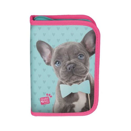 Piórnik jednokomorowy z dwoma klapkami z wyposażeniem (długopis, ołówek, 7 pisaków, 9 kredek, gumka, linijka, temperówka, ekierka). Zadrukowane kolorowe wnętrze.