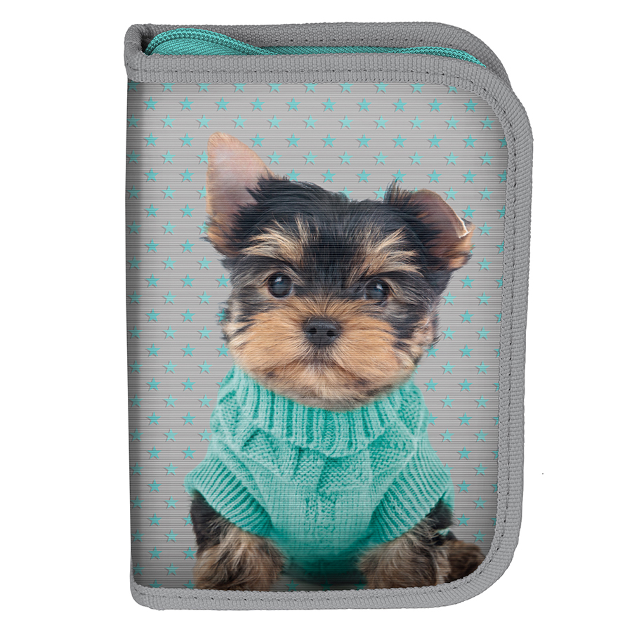 Piórnik jednokomorowy z dwoma klapkami z wyposażeniem (długopis, ołówek, 7 pisaków, 9 kredek, gumka, linijka, temperówka, ekierka). Zadrukowane kolorowe wnętrze.