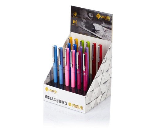 Stylowe pióro wieczne z nowym, eleganckim wykończeniem. Klips, stalówka oraz obrączka korpusu pokryte wysokiej jakości powłoką niklową, stalówka zakończona irydową kulką dla zapewnienia doskonałej jakości i łatwości pisania, wymienne naboje atramentowe Zenith. Display 15 sztuk + 1 sztuka gratis, mix kolorów.