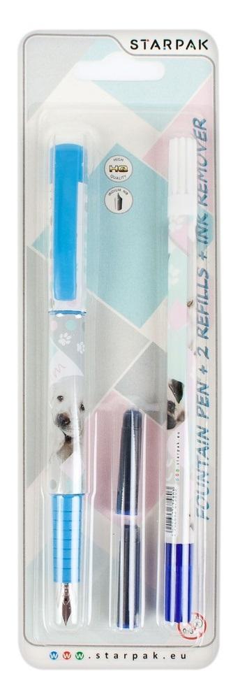 Komplet Pióra wiecznego z dwoma nabojami oraz wymazywaczem z kolekcji Starpak z licencją Cuties. Pióro wieczne o kształcie dostosowanym do dłoni dziecka, z wytrzymałą stalówką, wykonaną z wysokiej jakości materiału. Specjalnie wyprofilowana, antypoślizgowa strefa uchwytu zapewnia komfort i pomaga w nauce pisania Twojego dziecka. W piórze znajduje się miejsce na zapasowy wkład, dzięki czemu Twojemu dziecku nigdy nie zabraknie atramentu w trakcie pisania. W zestawie dwa naboje wymienne i dwustronny wymazywacz w pisaku. Końcówka wymazująca oznaczona białą zakrętką skutecznie usuwa błędy, a końcówka korygująca oznaczona niebieską zakrętką pozwala na poprawę błędów. Całość została ozdobiona nadrukiem słodkich zwierzątek Cuties. Zapoznaj się również z innymi produktami Starpak z serii Cuties! Produkt pakowany na blistrze. Przeznaczony dla dzieci w wieku: 3+.