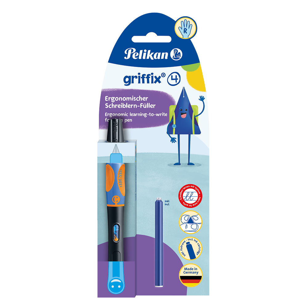 Dwie wersje: dla dzieci prawo- i leworęcznych. Odporna na nacisk stalówka ze stali nierdzewnej. Duże okienko na atrament w obudowie pióra wiecznego zapewnia optymalną kontrolę poziomu atramentu.