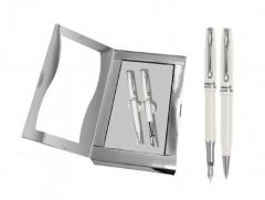 Zawiera pióro wieczne oraz długopis w kolorze białym.