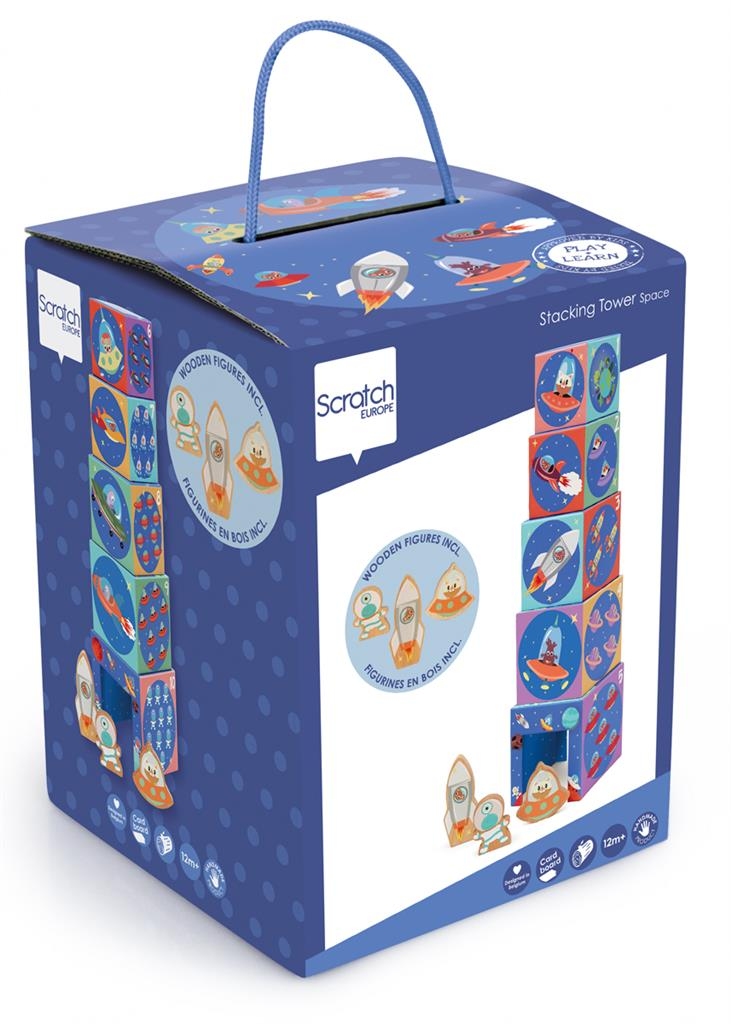 Kolorowa wieża z klocków z pięcioma sześcianami w różnych rozmiarach. Do zestawu dołączone są drewniane figurki: rakieta, statek kosmiczny, ludzik. Dziecko ma za zadanie ustawić piramidę z 5 kostek kolejno zaczynając od największej tak, aby tworzyła ona logiczny ciąg składający się z obrazków.