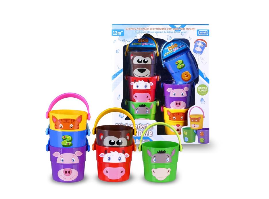 Piramidka- mini wiaderka kąpielowe Edu&Fun zawiera 6 kolorowych wiaderek z uchwytami i wizerunkami zwierząt oraz cyferki. Na spodzie każdego wiaderka znajduje się otwór, mozna ustawiać wiaderka w formie wieży
