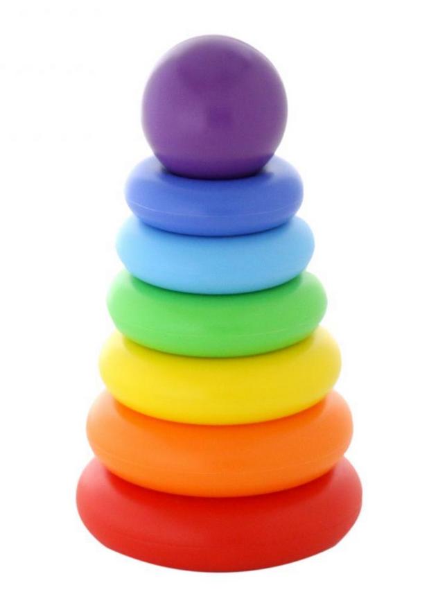 Kolorowa piramidka z siedmioma obręczami do nakładania, wysokość 24 cm.