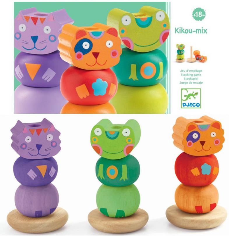 3 kolorowe piramidy wykonane z drewna. Każda z nich przedstawia inne zwierzątko, a każde zwierzątko składa się z 3 części.
