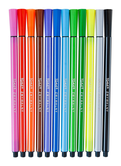 Flamastry szkolne, z tuszem na bazie wody, tusz odporny na działanie wody i światła, do stosowania na różnych rodzajach papieru, tusz flamastrów jest łatwo spieralny z rąk oraz odzieży, nie przebija na drugą stronę papieru. Komplet 12 kolorów. Fibrowa końcówka 0,8 mm.