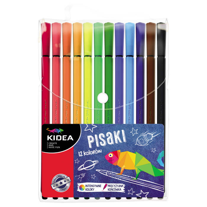 Zestaw 12 pisaków w wygodnym etui zapinanym na klips. Intensywne kolory gwarantują wykonanie efektownych prac. Cienka końcówka pozwala na precyzyjne rysowanie i kolorowanie. W zestawie znajduje się zabawna kolorowanka.