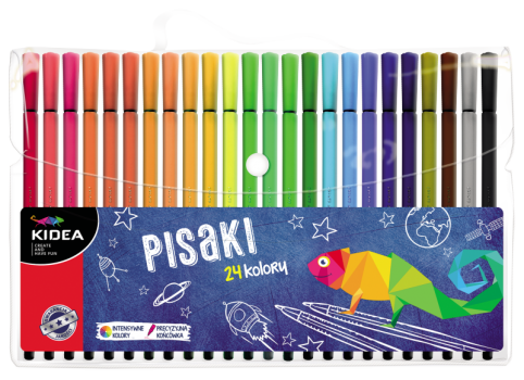 Zestaw 24 pisaków w wygodnym etui zapinanym na klips. Intensywne kolory gwarantują wykonanie efektownych prac. Cienka końcówka pozwala na precyzyjne rysowanie i kolorowanie. W zestawie znajduje się zabawna kolorowanka.