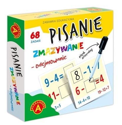 Pisanie Zmazywanie - Odejmowanie adresowane jest do dzieci zaczynających naukę matematyki. Na kartach zestawu znajduje się 68 zadań na odejmowanie. Niewiadomą może być jedna z 3 liczb występujących w działaniu. Działania przeprowadzane są na liczbach od 1 do 20. Niewiadome w zadaniu wpisuje się zmazywalnym pisakiem, co umożliwia wielokrotne wykorzystanie kart. Zabawka jest świetną zachętą do pamięciowego liczenia, samodzielnego poszukiwania rozwiązań rozwijając naturalne zdolności. Każdy wpisany wynik działania można zweryfikować w rozwiązaniu podanym na odwrotnej stronie karty. Poręczny rozmiar opakowania pozwala na zabranie zabawki ze sobą dosłownie wszędzie.