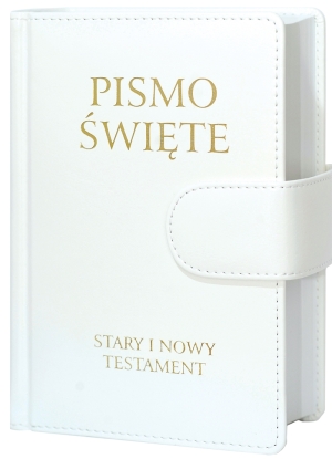 Praktyczne, kieszonkowe wydanie Pisma Świętego, w oprawie skóropodobnej z zapięciem magnetycznym, w kolorze białym.