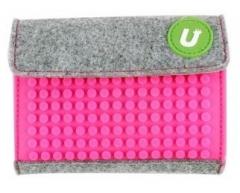 Szary filcowy portfelik  z panelem silikonowym w kolorze fuksji ( panel silikonowy - jest to specjalna powierzchnia, na której za pomocą silikonowych pixelowych klocków można układać niepowtarzalne wzory, które nadają produktowi wyjątkowy charakter ) o wymiarach 15 x 10 punktów , co daje 135  pozycji, aby układać swoje pomysły. Pokryty pikselami panel portfelika  jest giętki i niezwykle trwały. Piksele bardzo dobrze trzymają się powierzchni, przez co są odporne na codzienne użytkowanie produktu.