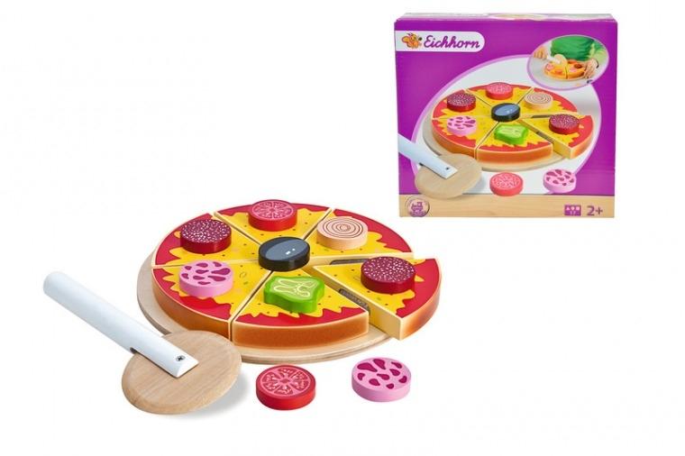 Drewniany zestaw, 17 elementów, 6 kawałków pizzy, przyrząd do cięcia, składniki,
