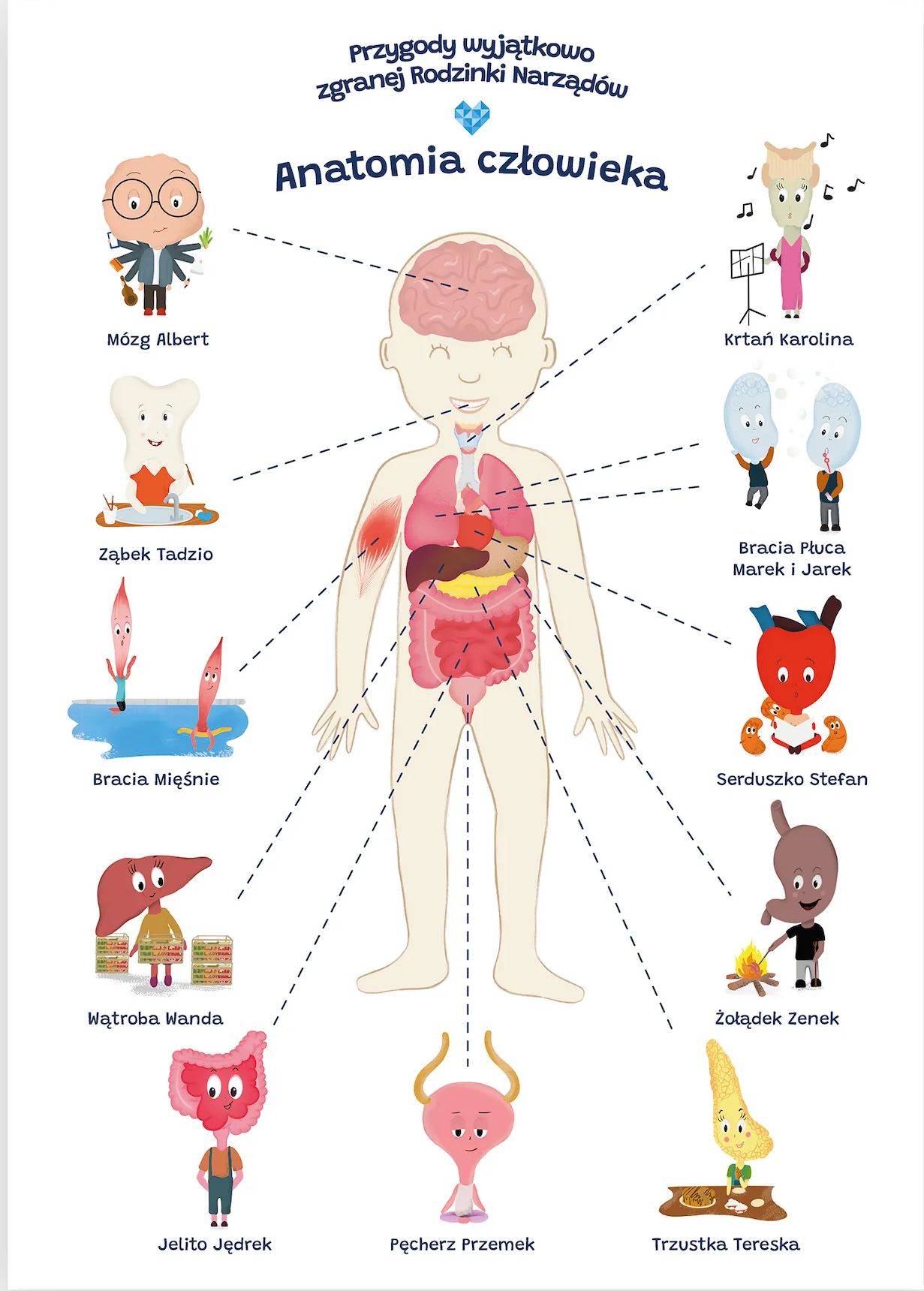 ŚWIETNA POMOC NAUKOWA Plansza przedstawia wszystkie najważniejsze narządy człowieka w swoim anatomicznym położeniu.
