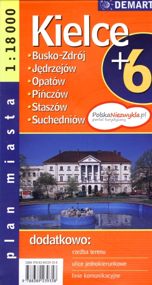 Plan Kielc w skali 1:18 000 plus centrum w skali 1:10 000, wzbogacony o plany najważniejszych miast w okolicy.- Ulice jednokierunkowe, sygnalizacja świetlna, znaki kontroli radarowej- Linie komunikacyjne- Rzeźba terenu Spisy ulic i informacje teleadresowe okolicznych miast- Szlaki turystyczne i ścieżki rowerowe.