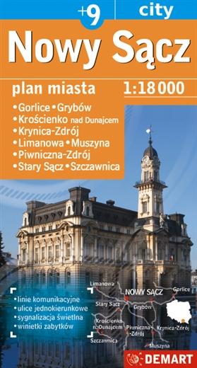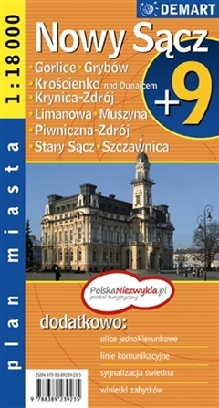 Plan Nowego Sącza w skali 1:18 000 plus centrum w skali 1:10 000Wzbogacony o plany najważniejszych miast w okolicy.- Ulice jednokierunkowe- Sygnalizacja świetlna- Znaki kontroli radarowej- Wysokości wiaduktów- Linie komunikacyjne- Rzeźba terenu- Spisy ulic i informacje teleadresowe- Szlaki turystyczne i ścieżki rowerowe- Rysunki i opisy wybranych zabytków Nowego Sącza i Starego Sącza.