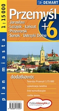 Plan Przemyśla w skali 1:15 000 plus centrum w skali 1:7 500, wzbogacony o plany najważniejszych miast w okolicy.- Ulice jednokierunkowe- Sygnalizacja świetlna- Linie komunikacyjne- Spisy ulic i informacje teleadresowe okolicznych miast- Szlaki turystyczne- Rysunek Skansenu w Sanoku- Schemat Twierdzy Przemyśl- Rysunki i opisy wybranych zabytków Przemyśla.