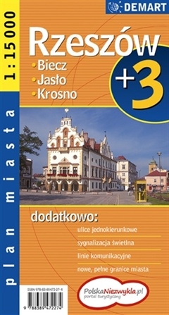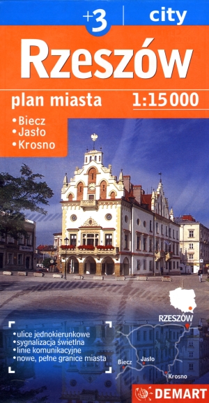 Plan Rzeszowa w skali 1:15 000 plus centrum w skali 1:7 500, wzbogacony o plany najważniejszych miast w okolicy. - Mapa okolic w skali 1:350 000- Ulice jednokierunkowe- Sygnalizacja świetlna- Linie komunikacyjne- Spisy ulic i informacje teleadresowe- Szlaki turystyczne.