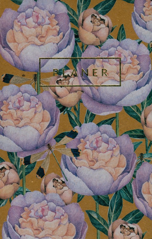 Okładka planera z ilustracją w kwiaty piwonii i złotym tłoczeniem oraz kolorowy zadruk środka podkreśla gustowną stylizację.