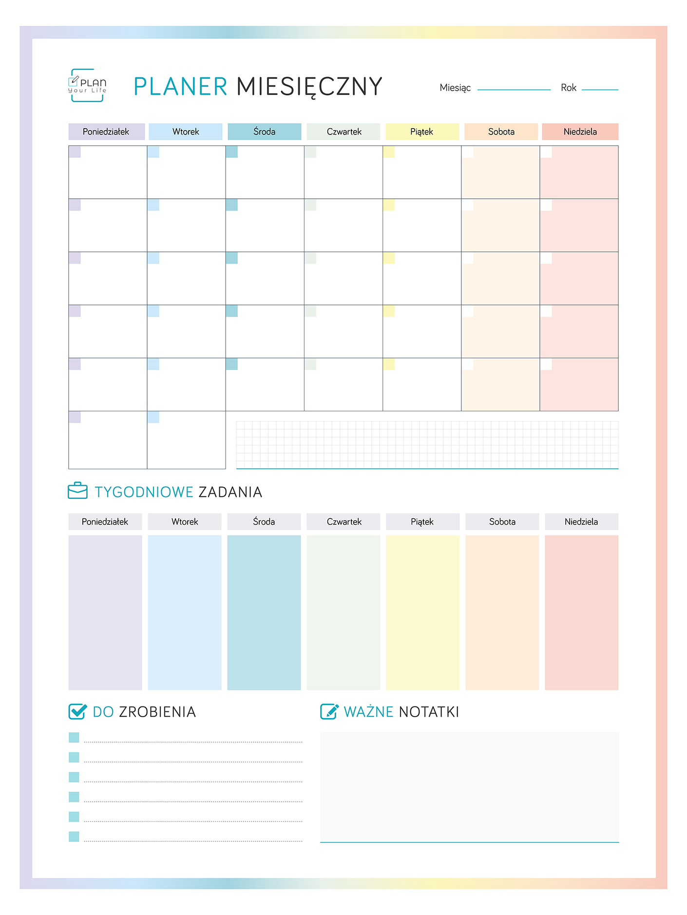 PLANER MIESIĘCZNY MAGNETYCZNY - tęczowy Marka: Plan Your Life Wymiary: 60 x 45 cm Planer wyposażony jest w magnetyczny podkład, dzięki czemu można go ulokować na lodówce jak i każdej innej powierzchni metalowej. Planer ten znacznie ułatwi zaplanowanie obowiązków i najważniejszych wydarzeń nadchodzącego miesiąca, nadaję się zarówno do domu, szkoły czy biura. Mocny magnes i warstwowa budowa Silny magnes powoduje, że planer się nie zsuwa i nie przemieszcza podczas pisania. Wytrzymała powierzchnia z nanomateriałów ułatwiająca ścieranie - sprawi, że planer będzie Ci długo służył nawet podczas bardzo intensywnego użytkowania! Do każdego planera marker GRATIS.