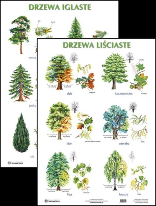 Sprzedaż 1-4 plansz tylko bezpośrednio w Wydawnictwie lub w Księgarni Wydawnictwa. Plansza pokazuje najpopularniejsze drzewa rosnące w Polsce. Na jednej stronie znajdują się drzewa iglaste, na drugiej liściaste. Dzieci mogą zapoznać się z wyglądem danego drzewa: kolorystykę jego liści na wiosnę i na jesień. Obok przedstawiono powiększenie liści (igieł), kwiatów i owoców.Planszę można wykorzystać na każdym etapie nauki: zarówno w przedszkolu, klasach 1-3, jak i na lekcjach przyrody.