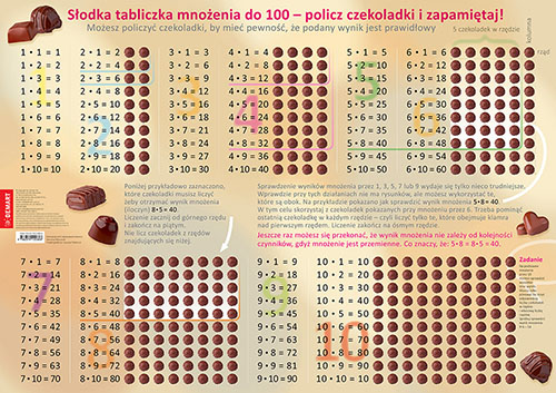 I strona: tabliczka mnożenia w zakresie 100 w formie tabeli oraz wyszczególnione działania mnożenia przez poszczególne liczby: 1 x 1 i 1 x 2.. 1 x 10; 2 x 1 i 2 x 2 .. 2 x 10 itd. aż do dziesięciu.
